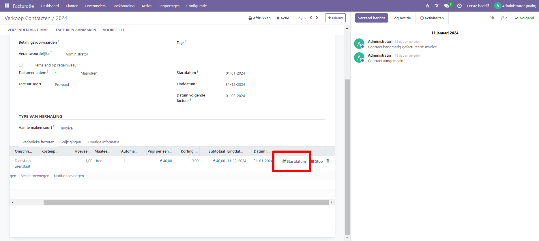 Een beeindigde contractregel kun je eenvoudig weer hernieuwen door op de Startdatum kalender knop te klikken links van de Stop knop.