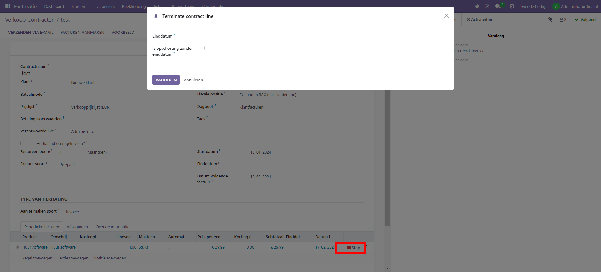 Je kunt op een lopend contract de regels stopzetten via de Stop knop die naast de contract regel staat. Je kunt zelf de einddatum opgeven en daarnaast ook aangeven of het een opschorting is zonder einddatum.