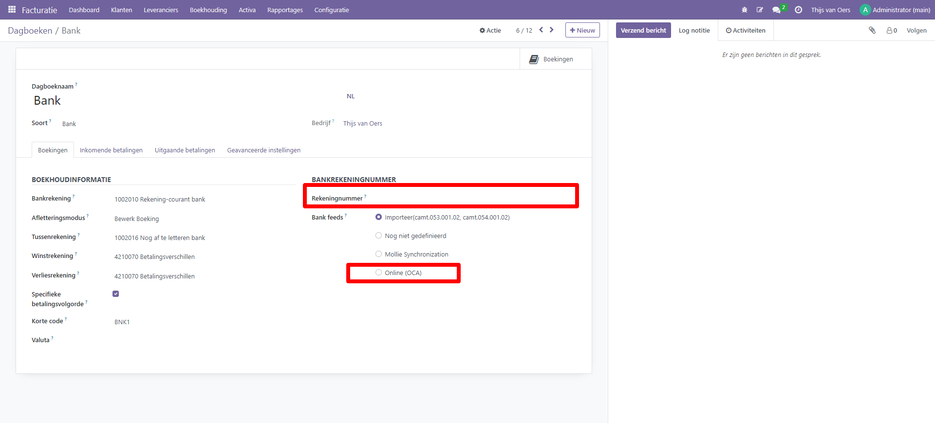 Koppelen banknummer: Standaard hebben we 1 bank geconfigureerd in CURQ. Voeg je bankrekening toe, zoals getoond in onderstaand voorbeeld. Activeer ook de optie (OCA)Online, hiermee activeer je de optie voor bank synchronisatie.