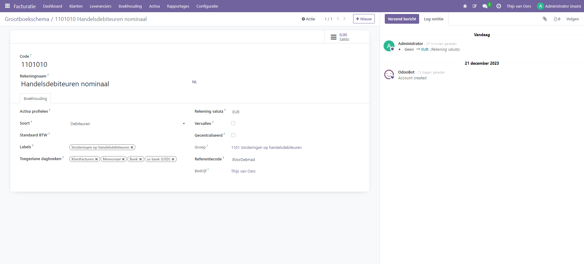 Rekening valuta: Indien gevuld dienen alle boekingsregels van deze rekening de ingevoerde valuta te hebben (bijvoorbeeld bankjournalen). Als er geen valuta is ingesteld, kun je bij boekingen elke actieve valuta gebruiken.
