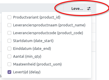 In dit overzicht kun je één of meerdere leveranciers koppelen met de bijbehorende inkoopprijzen en levertijden. Via de filterknop zijn meerdere ‘standaard’ velden zichtbaar te maken (zie onder).