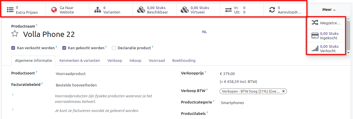 De verkoopprijs wordt excl. BTW ingevuld, de BTW label heeft standaard keuzes uit 0%, 9%, 21% en export BTW (onderverdeeld in goederen en diensten).