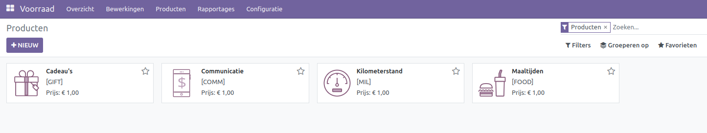 In dit voorbeeld maak ik gebruik van toegang via de Voorraad app. Als je deze procedure volgt, krijg je een overzicht te zien van enkele ‘standaard’ geïnstalleerde producten.