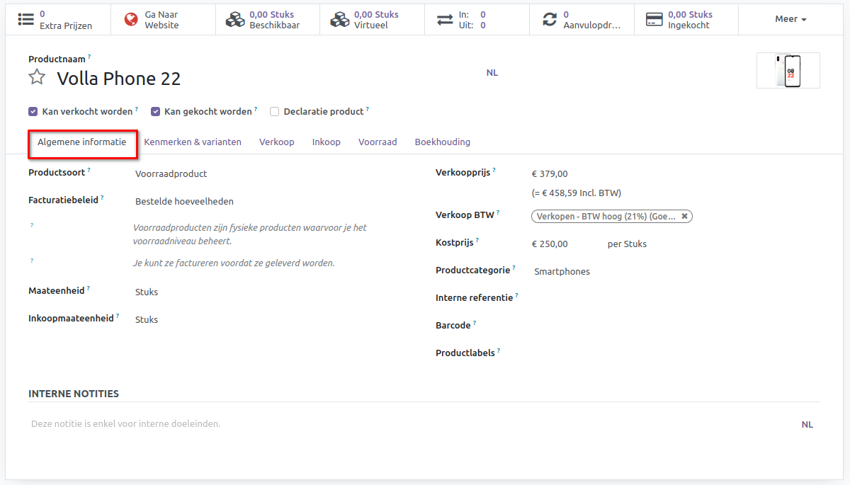 Met Inkoop BTW kun je de standaard belastingtarieven instellen die van toepassing zijn bij de aankoop van het product. Onder Controlebeleid kun je kiezen of je de inkoopfactuur wilt baseren op de bestelde hoeveelheden of de ontvangen hoeveelheden. Daarnaast kun je notities toevoegen aan inkooporders met behulp van de ‘Inkoop Beschrijving’. Deze functies helpen bij het beheren van inkoopgerelateerde aspecten en het vastleggen van belangrijke informatie voor het inkoopproces.