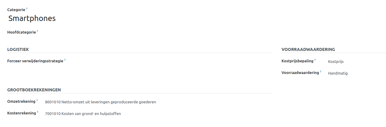 Dit veld wordt gebruikt om de voorraad te waarderen en om marges op verkooporders te berekenen. De voorraadwaardering stel je in op productcategorie. Bij gemiddelde kostprijs en FIFO wordt de kostprijs automatisch berekend.