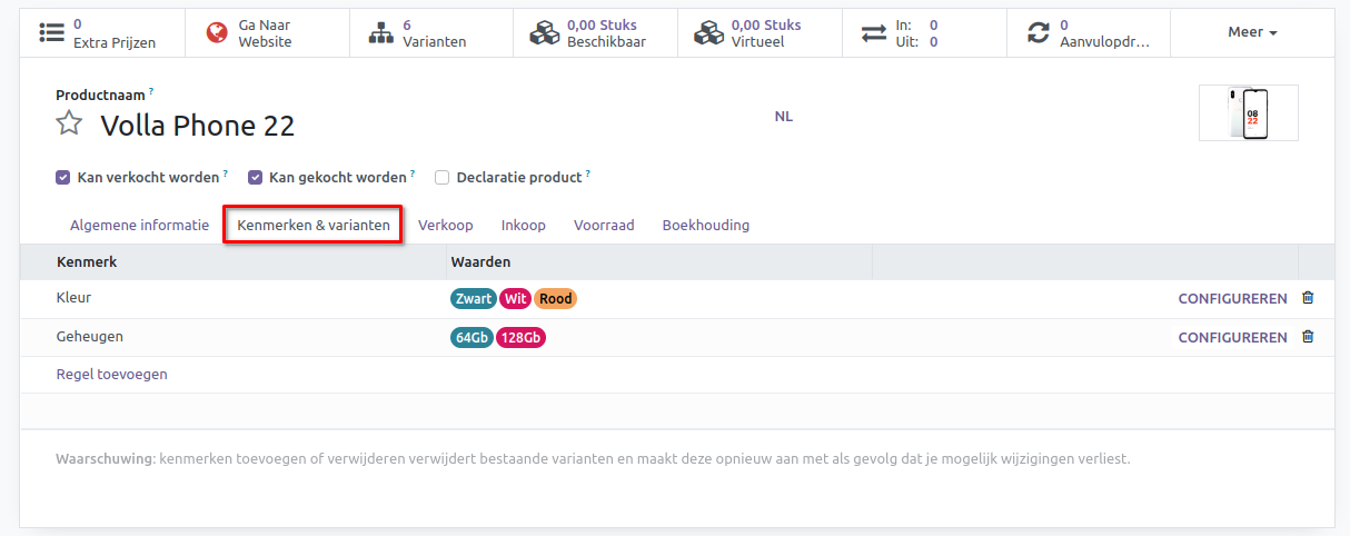 Via tab Kenmerken en varianten kun je kenmerken instellen voor een product als deze in verschillende opties verkrijgbaar zijn. Kenmerk en waarde kun je zelf aanmaken via Voorraad - configuratie - kenmerken. Aan de hand van het aantal waarden maakt CURQ automatisch de verschillende varianten aan (zie 6 Varianten). Via ‘configureren’ in de regel kun je prijsverschillen instellen per waarde die is opgegeven.