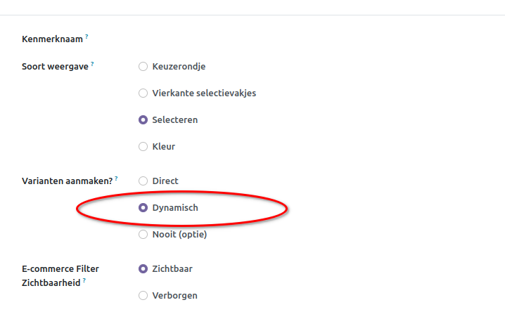 Tip! Als je voor een product meerdere kenmerken en waarden instelt, wat resulteert in 1500 of meer varianten, overweeg dan om ‘Dynamisch’ te selecteren in de instellingen. Op deze manier worden varianten pas aangemaakt wanneer ze daadwerkelijk worden verkocht, wat geen invloed heeft op de database prestaties.