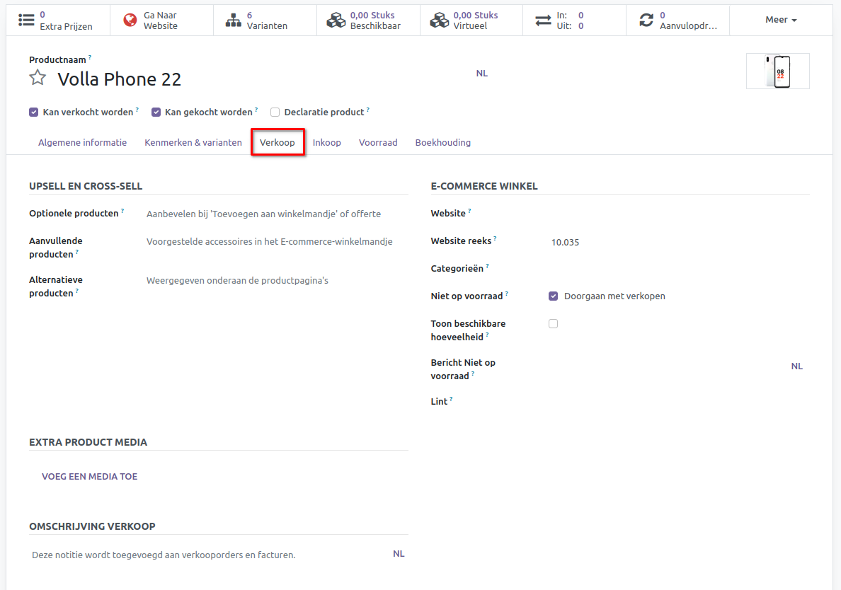 Extra afbeeldingen zijn toe te voegen via ‘Extra product media’ en er is ruimte om een verkoopomschrijving op te stellen dat zichtbaar is op een offerte/order en facturen.
