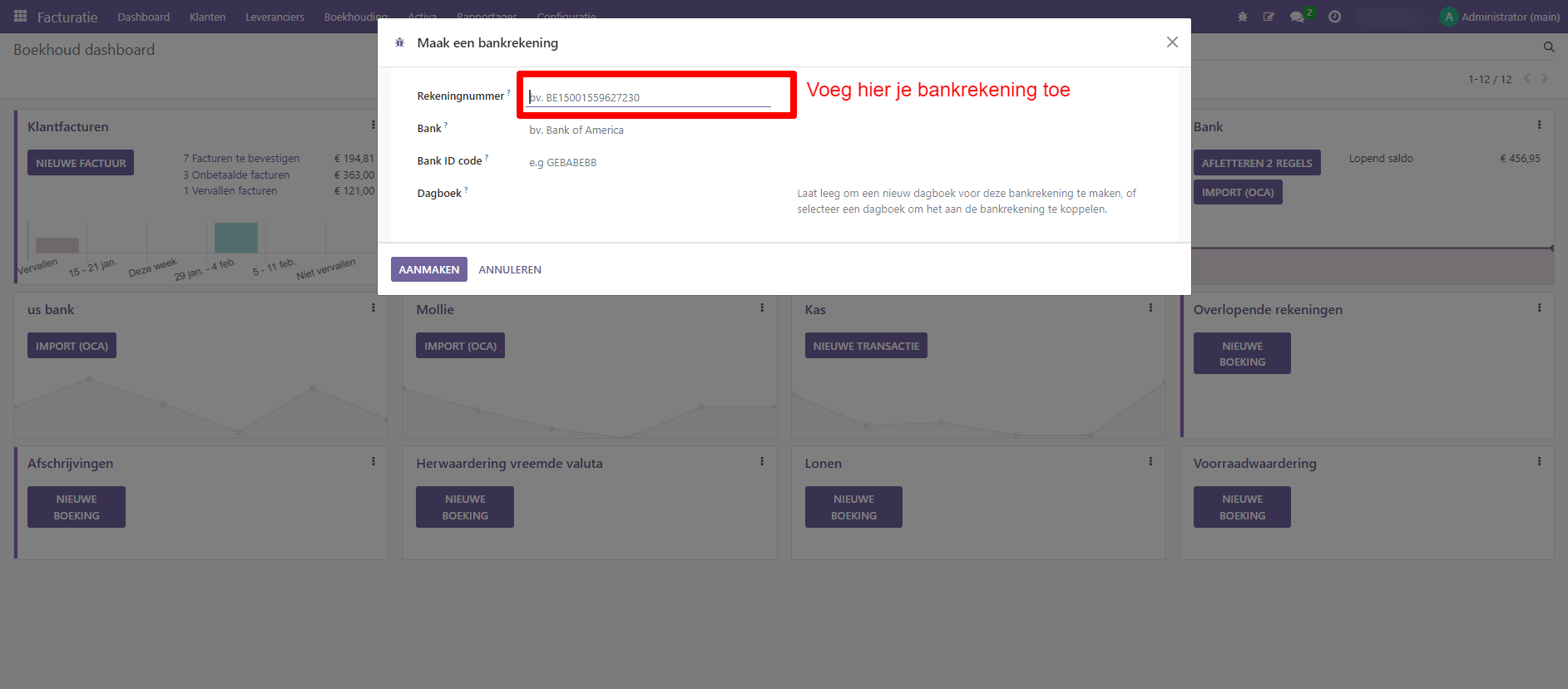 Bankrekening: Koppel de juiste grootboekrekening aan de bank hier.