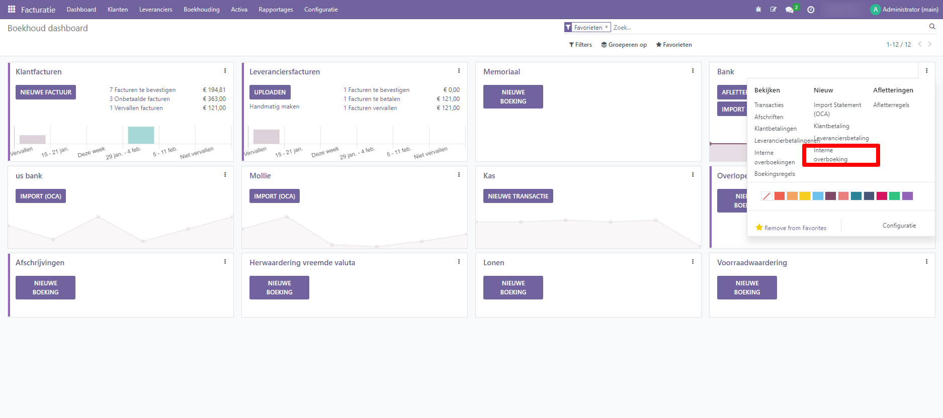 Als je geld wilt overmaken van de ene bank naar de andere, ga dan naar het Boekhouddashboard, klik op de keuzeknop (⋮) bij de bank van waaruit je de overschrijving wil doen en klik vervolgens op Betalingen. Selecteer of creëer een betaling, vink Interne overboeking aan en selecteer een Bestemmingsjournaal voordat je de interne overboeking bevestigt.