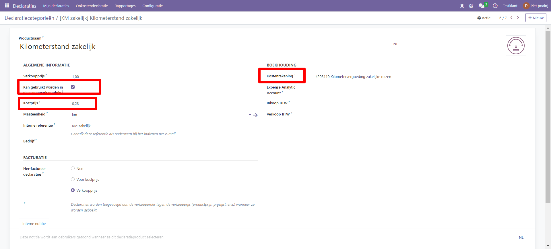 Om de geregistreerde kilometers te kunnen declareren, ga naar Menu > Declaraties > Configuratie > Declaratiecategorieën. In de onkostencategorie Kilometerstand (of maak een nieuwe categorie aan) moet het selectievakje ‘Kan gebruikt worden in de wagenpark module’ aangevinkt staan en bij FACTURATIE de optie ‘Verkoopprijs’ geselecteerd worden. Bij BOEKHOUDING is het ook mogelijk om een specifieke kostenrekening (grootboek) of analytisch account (kostenplaats) toe te voegen. Bij ALGEMENE INFORMATIE kun je ook de kilometervergoeding (Verkoopprijs) ingeven en kiezen voor de maateenheid km (kilometer) of mi (miles).