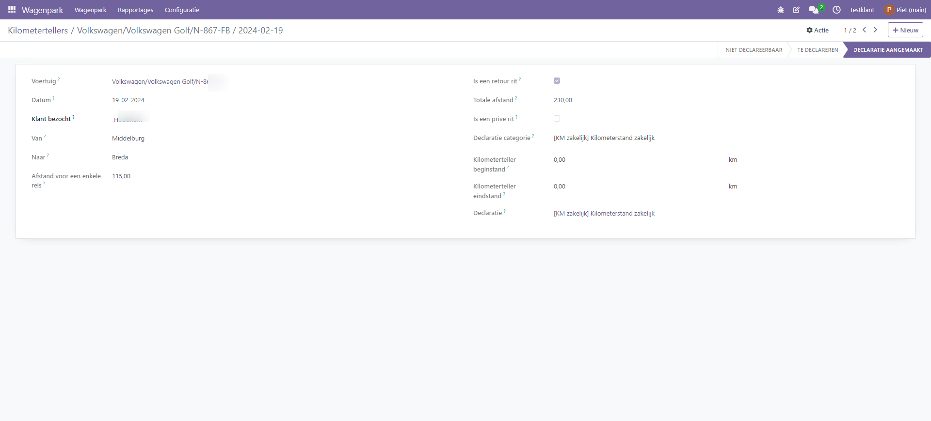 Deze module is een uitbreiding op de Wagenpark module en geeft de gebruiker de mogelijkheid om zakelijke ritten te registreren en te declareren. De module is gebaseerd op de Nederlandse belastingregels, maar kan ook worden gebruikt voor kilometerregistratie in het algemeen. In Nederland is het soms nodig om ook de privékilometers te registreren, vandaar dat we het (niet verplichte) veld ‘Is privérit’ hebben toegevoegd. Deze module verbindt de wagenparkmodule met de onkostenmodule.