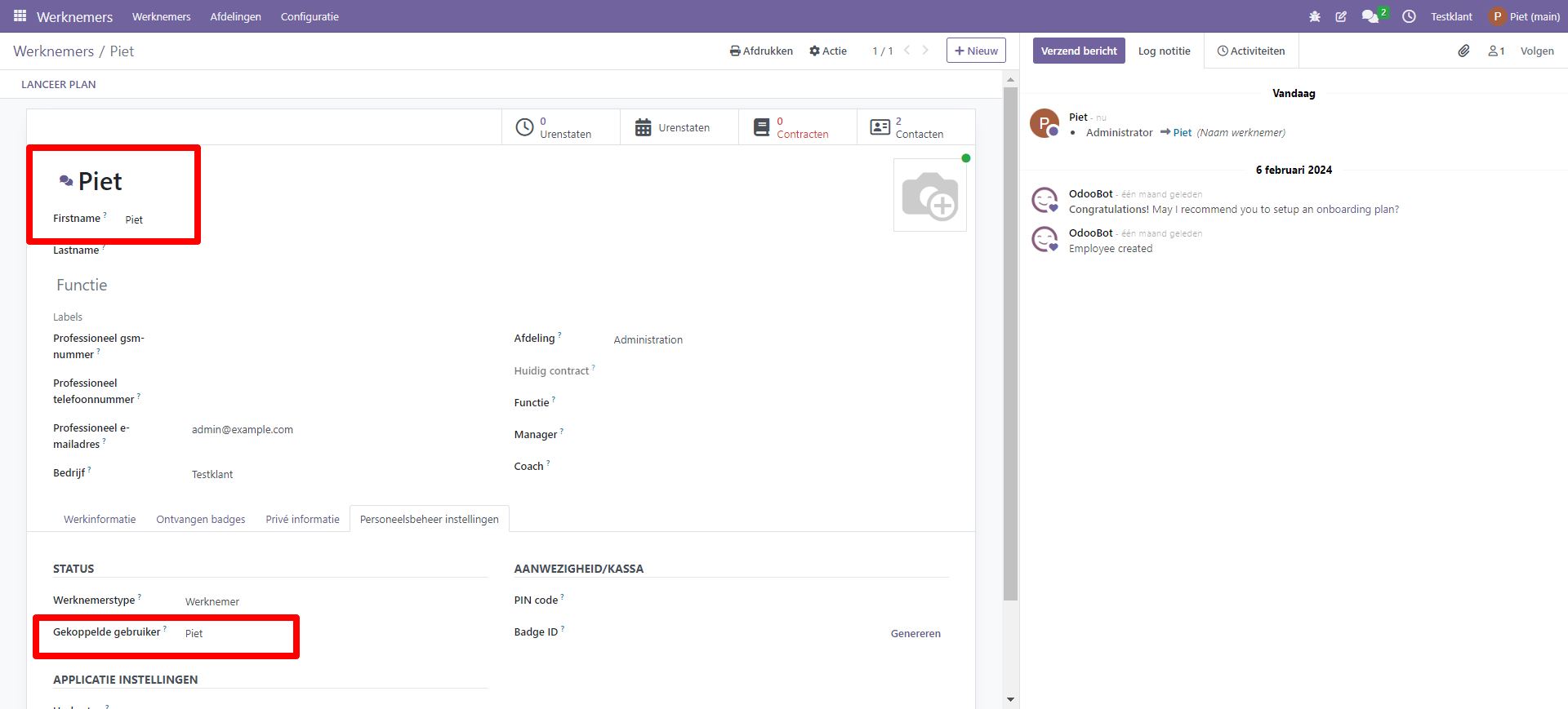 Via Menu > Werknemers maak je een werknemer aan en koppel je je gebruikersaccount (tab Personeelsbeheer instellingen) aan de werknemer.
