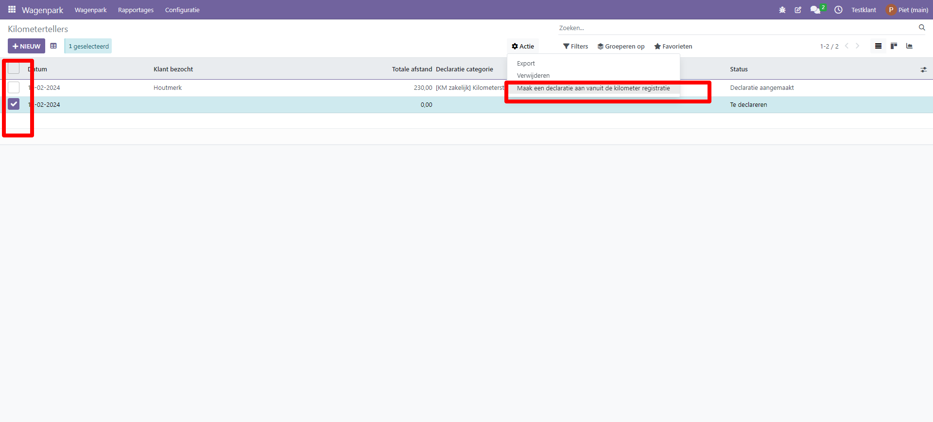 Via Menu > Wagenpark > Wagenpark > Kilometertellers kun je vanuit de lijstweergave de regels doorbelasten die de status ‘Te declareren’ hebben. Je selecteert deze regels, en declareert ze vervolgens via de actieknop. De status van de kilometer regels verandert vervolgens naar ‘Gedeclareerd’. Als het veld status in de lijstweergave staat dan zie je aangepaste status staan.