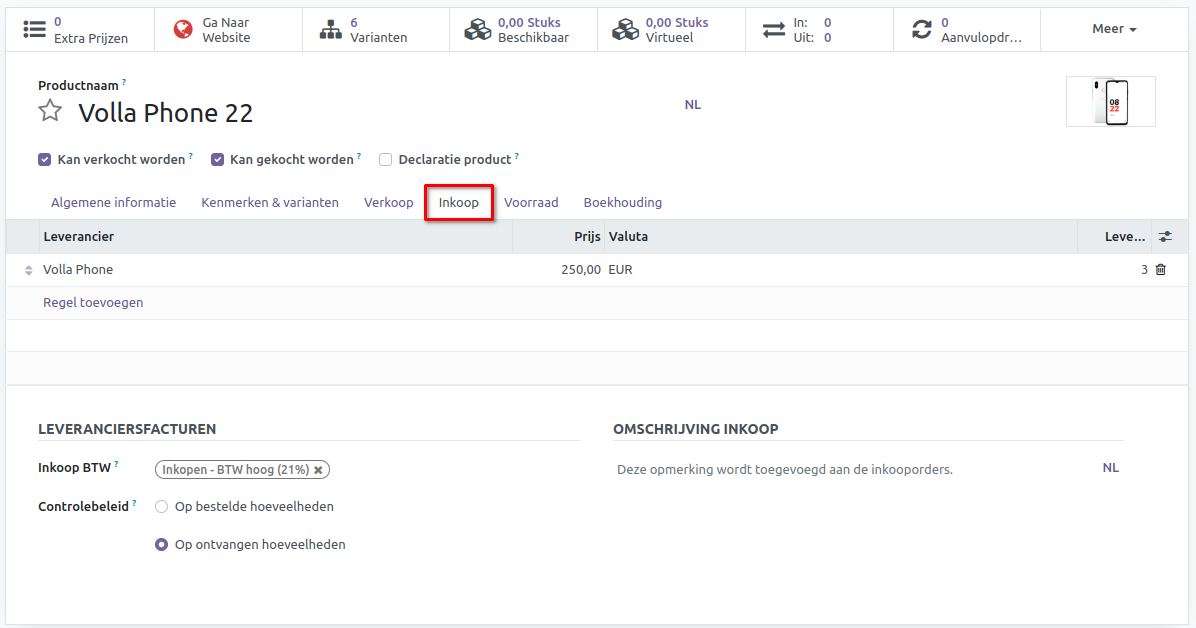 Met Inkoop BTW kun je de standaard belastingtarieven instellen die van toepassing zijn bij de aankoop van het product. Onder Controlebeleid kun je kiezen of je de inkoopfactuur wilt baseren op de bestelde hoeveelheden of de ontvangen hoeveelheden. Daarnaast kun je notities toevoegen aan inkooporders met behulp van de ‘Inkoop Beschrijving’. Deze functies helpen bij het beheren van inkoopgerelateerde aspecten en het vastleggen van belangrijke informatie voor het inkoopproces.